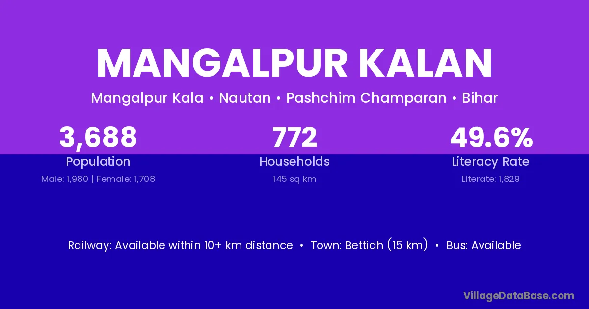 Bettiah (15 km) is the nearest town to Mangalpur Kalan village for major economic activities and is located approximately 15 km away.
