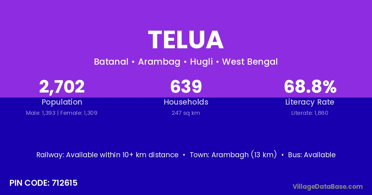 Telua village has a total population of 15,787 people, of which 8,300 are males and 7,487 are females.