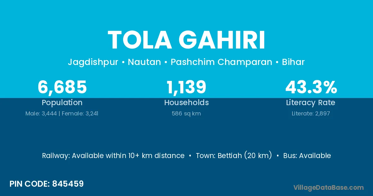 Bettiah (20 km) is the nearest town to Tola Gahiri village for major economic activities and is located approximately 20 km away.