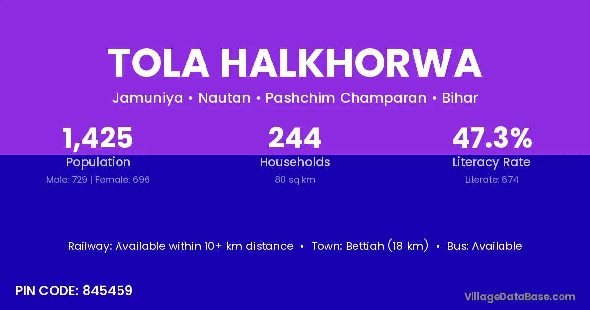 Bettiah (18 km) is the nearest town to Tola Halkhorwa village for major economic activities and is located approximately 18 km away.
