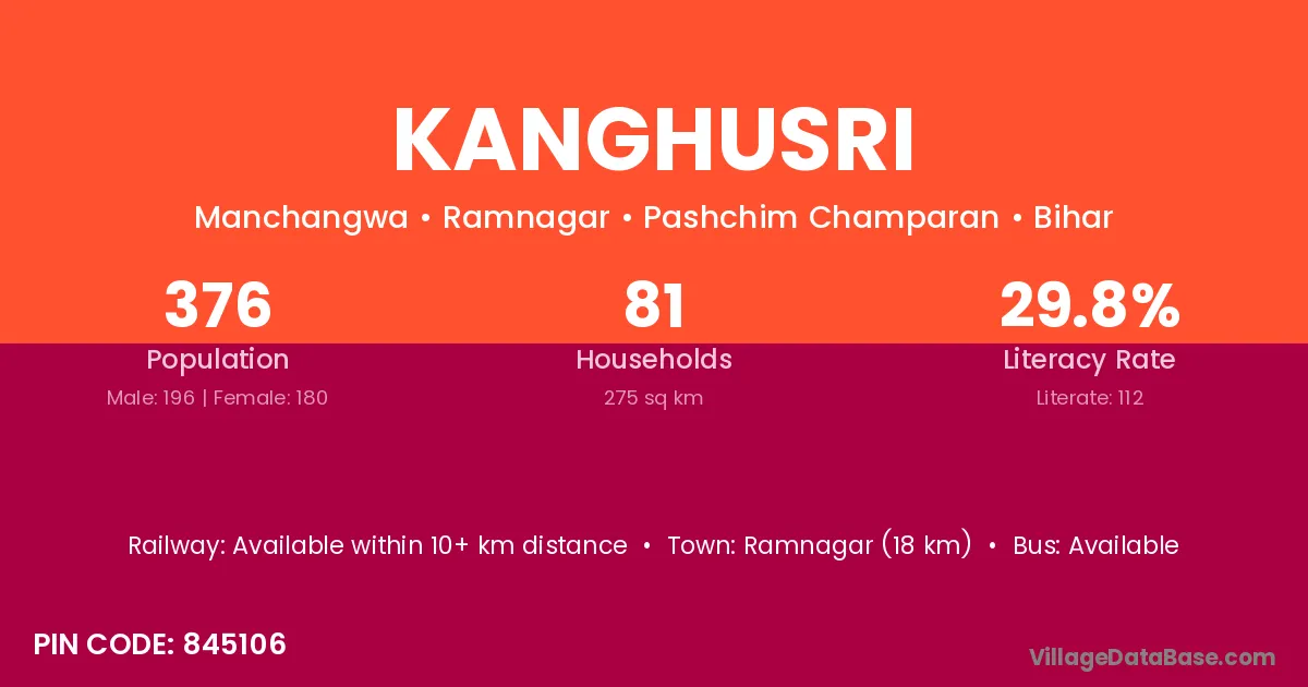 Ramnagar (18 km) is the nearest town to Kanghusri village for major economic activities and is located approximately 18 km away.