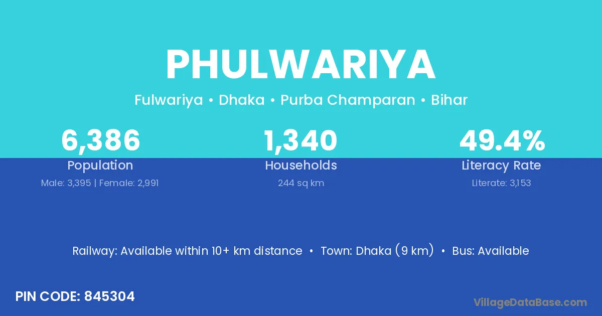Phulwariya village has a total population of 3,291 people, of which 1,702 are males and 1,589 are females.