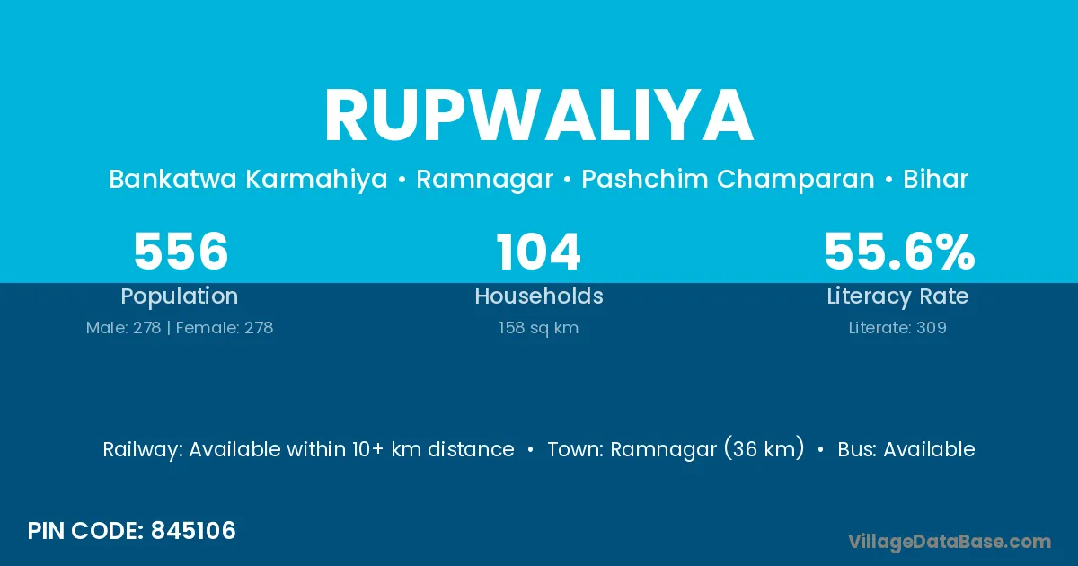 Ramnagar (36 km) is the nearest town to Rupwaliya village for major economic activities and is located approximately 36 km away.