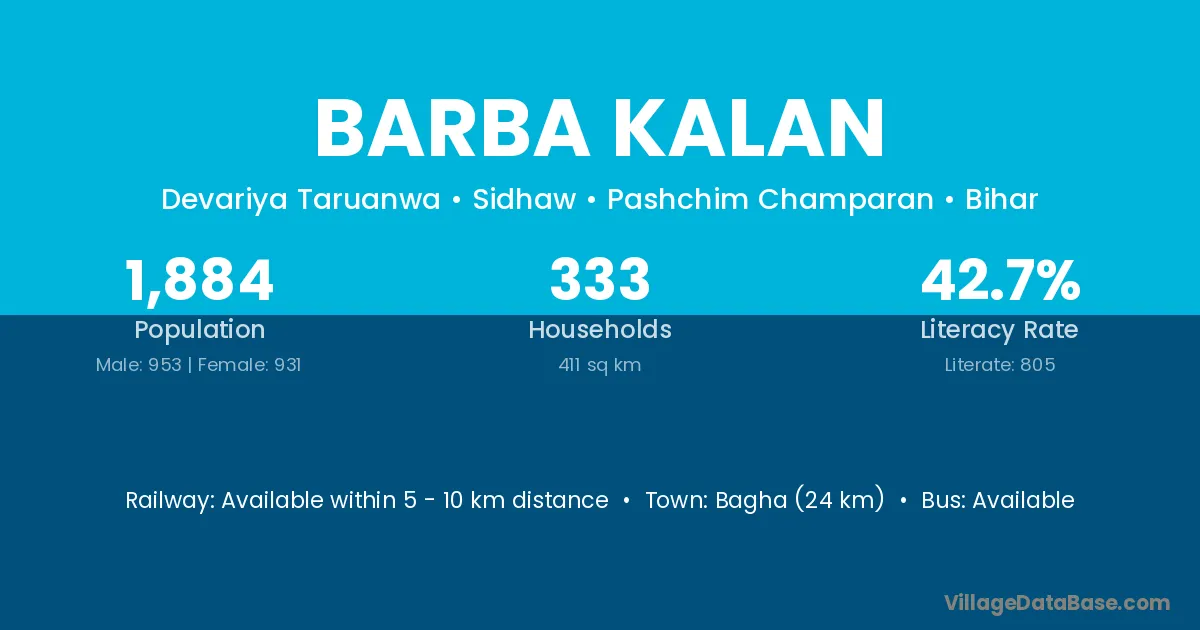 Barba Kalan village has a total population of 1,884 people, of which 953 are males and 931 are females.