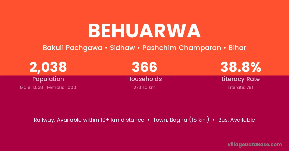 Bagha (15 km) is the nearest town to Behuarwa village for major economic activities and is located approximately 15 km away.