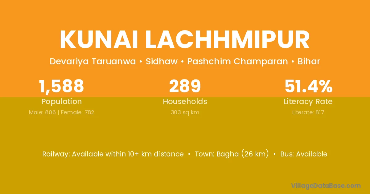 Bagha (26 km) is the nearest town to Kunai Lachhmipur village for major economic activities and is located approximately 26 km away.