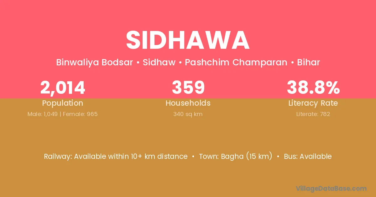 Bagha (15 km) is the nearest town to Sidhawa village for major economic activities and is located approximately 15 km away.