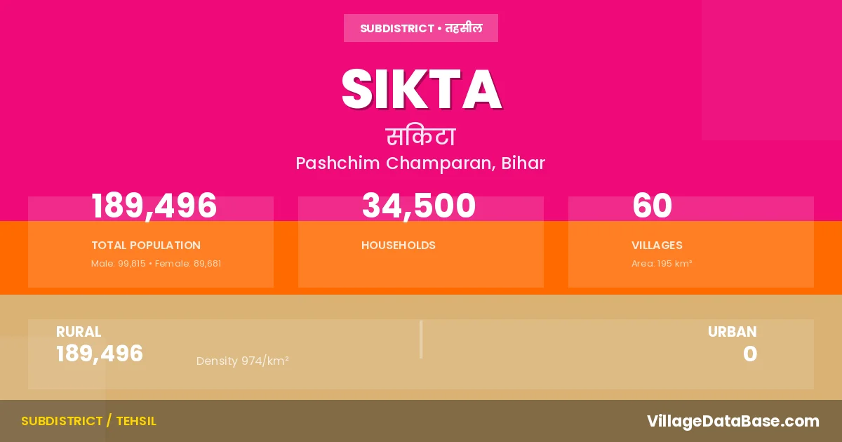According to the 2011 census The total area of Sikta Subdivision is 195 km², with a population of 189496 people. The population density is 974 inhabitants per square kilometre, and there are approximately 34500 houses in the sub district.