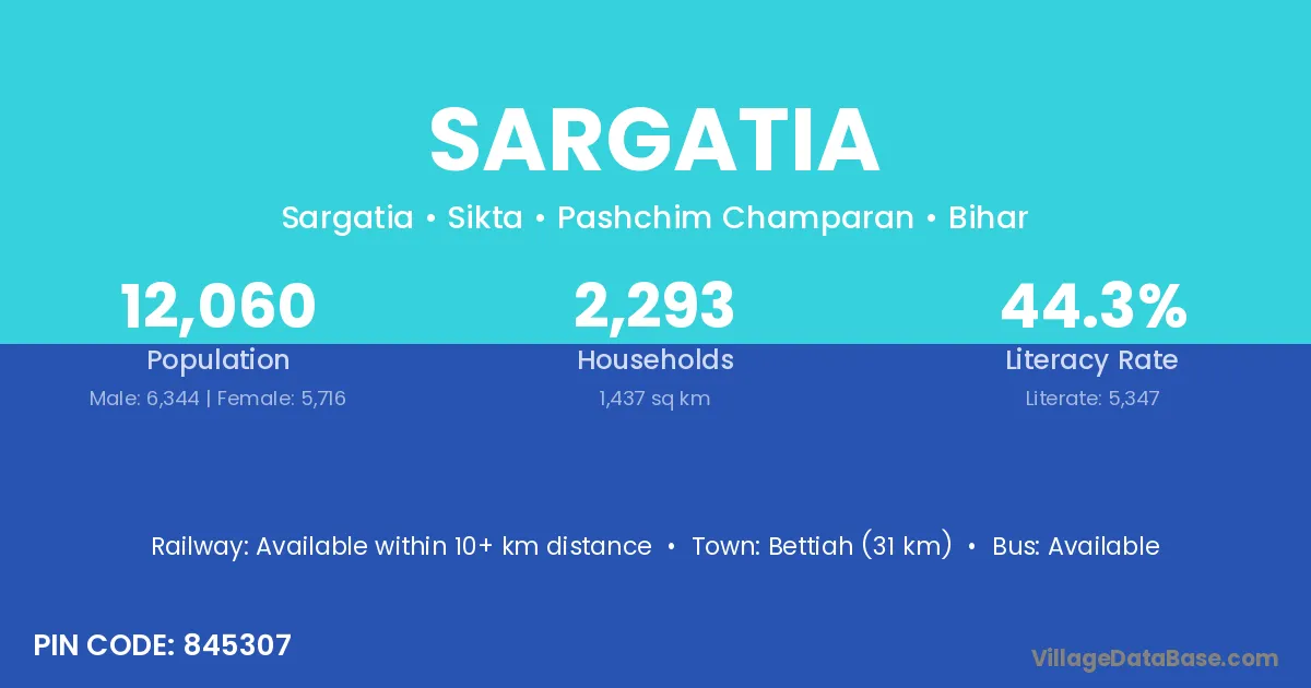 Bettiah (31 km) is the nearest town to Sargatia village for major economic activities and is located approximately 31 km away.