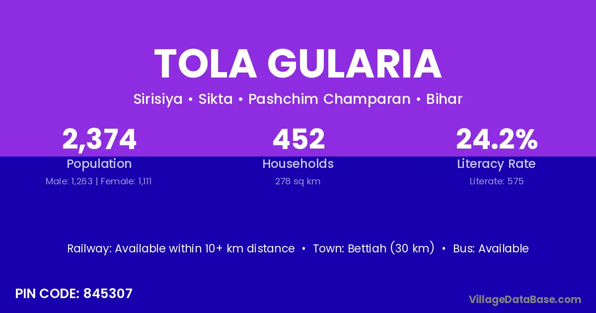 Bettiah (30 km) is the nearest town to Tola Gularia village for major economic activities and is located approximately 30 km away.