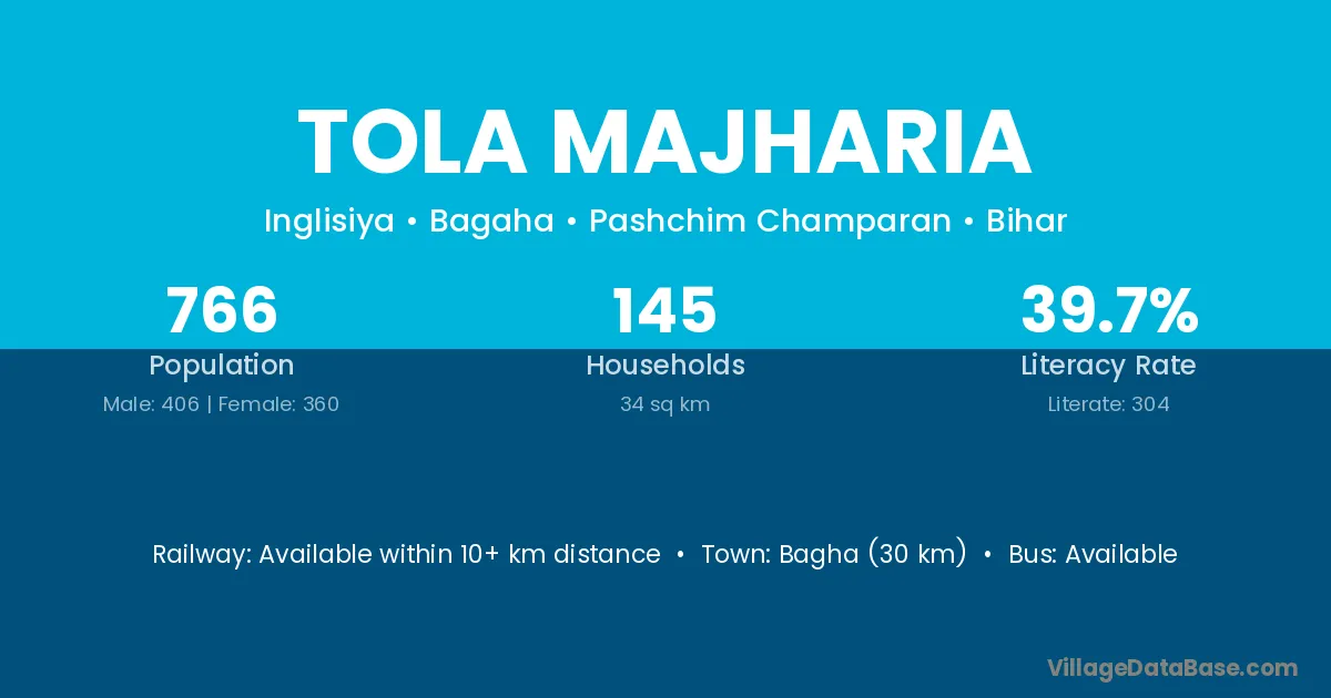 Bettiah (51 km) is the nearest town to Tola Majharia village for major economic activities and is located approximately 51 km away.