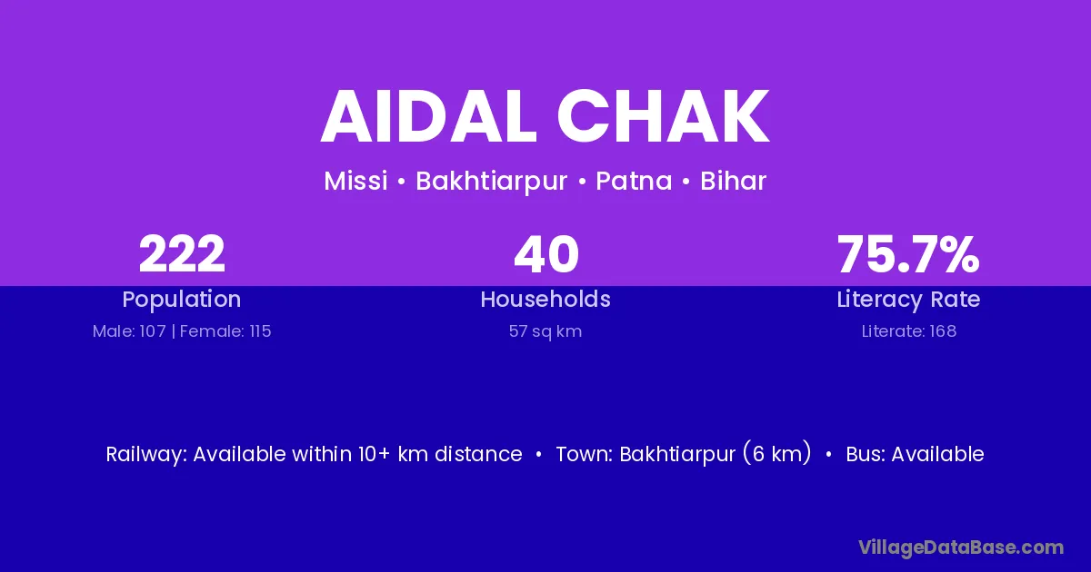 Bakhtiarpur (6 km) is the nearest town to Aidal Chak village for major economic activities and is located approximately 6 km away.