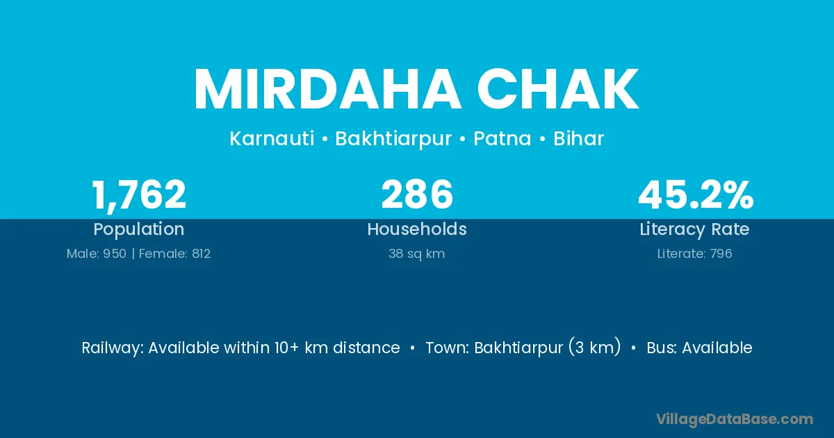 Bakhtiarpur (3 km) is the nearest town to Mirdaha Chak village for major economic activities and is located approximately 3 km away.