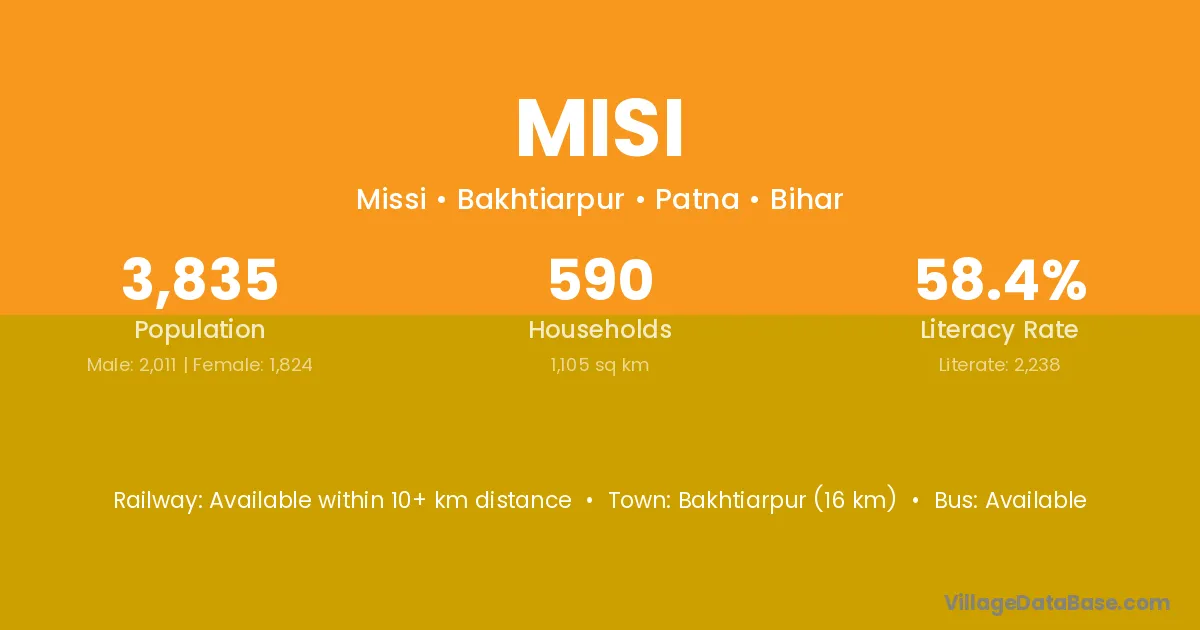 Bakhtiarpur (16 km) is the nearest town to Misi village for major economic activities and is located approximately 16 km away.