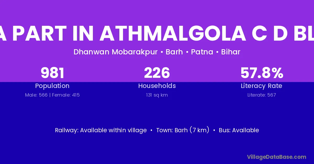 Pura Part In Athmalgola C D Block village has a total population of 981 people, of which 566 are males and 415 are females.