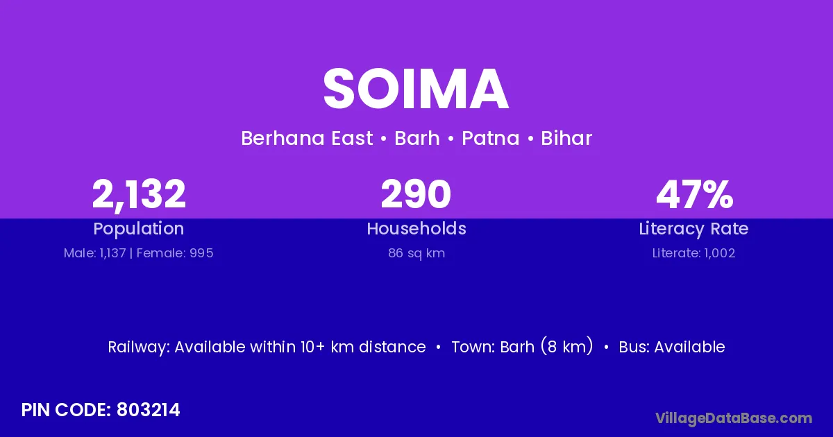 Barh (8 km) is the nearest town to Soima village for major economic activities and is located approximately 8 km away.