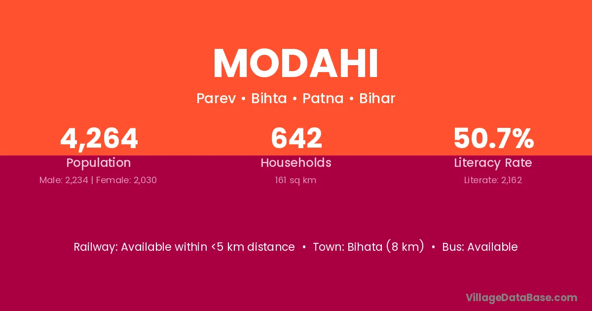 Bihata (8 km) is the nearest town to Modahi village for major economic activities and is located approximately 8 km away.