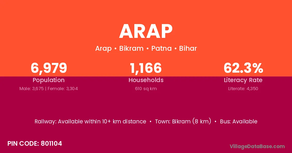Bikram (8 km) is the nearest town to Arap village for major economic activities and is located approximately 8 km away.