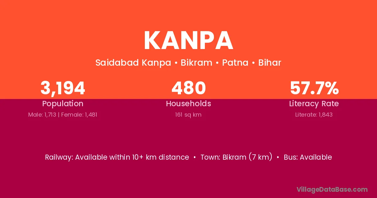 Kanpa village has a total population of 3,194 people, of which 1,713 are males and 1,481 are females.