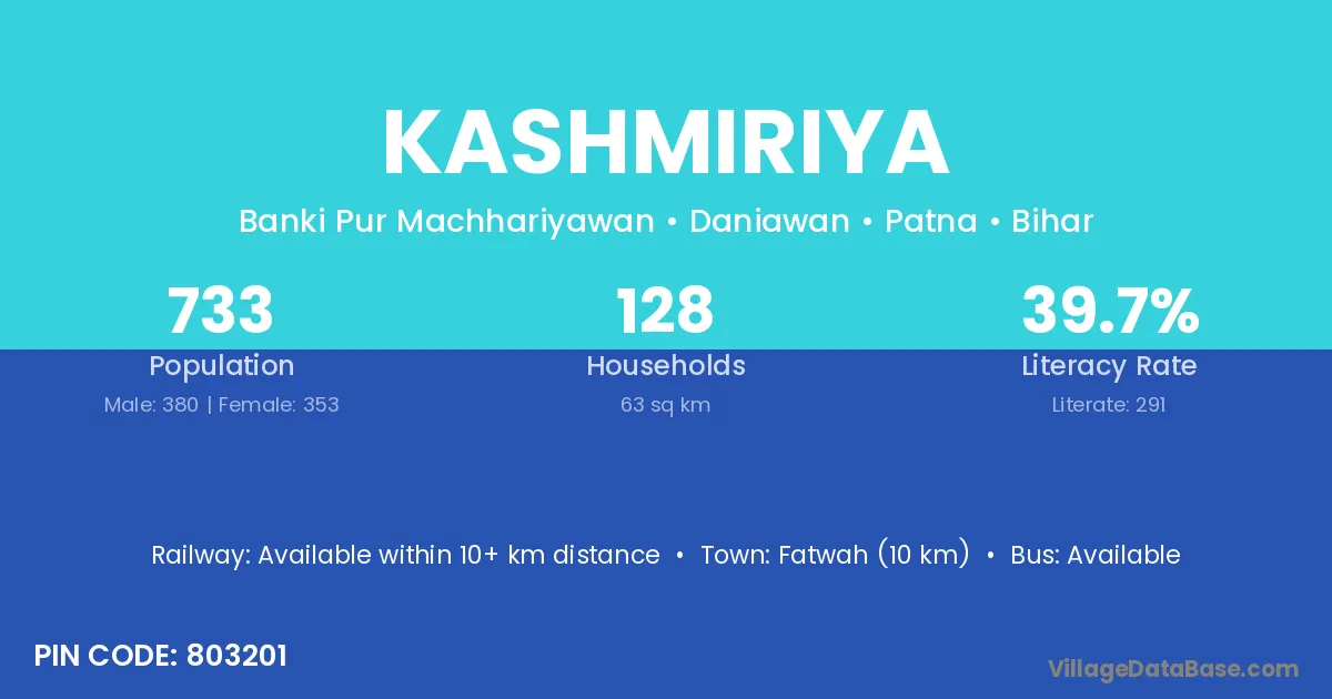 Fatwah (10 km) is the nearest town to Kashmiriya village for major economic activities and is located approximately 10 km away.