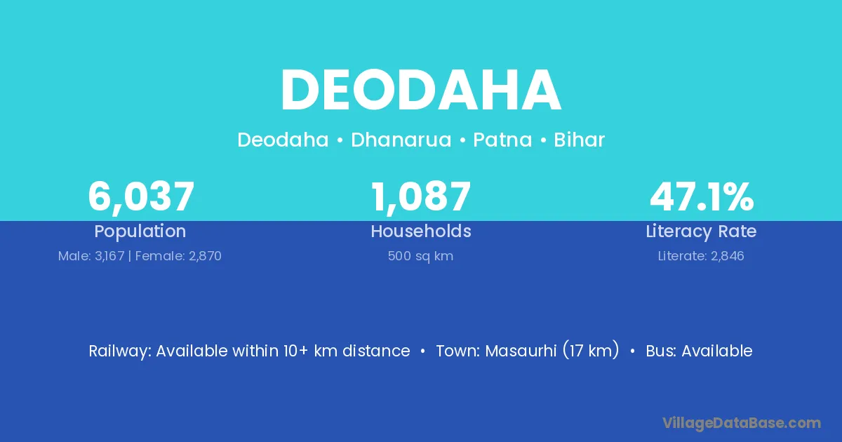 Masaurhi (17 km) is the nearest town to Deodaha village for major economic activities and is located approximately 17 km away.