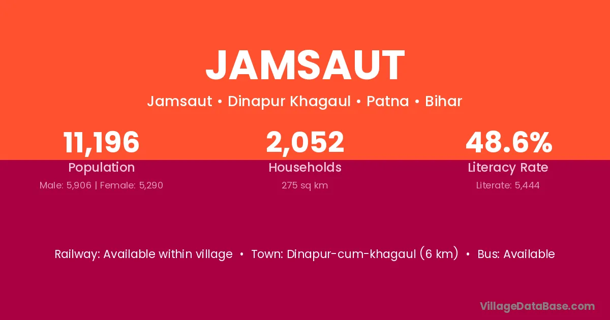 Dinapur-cum-khagaul (6 km) is the nearest town to Jamsaut village for major economic activities and is located approximately 6 km away.