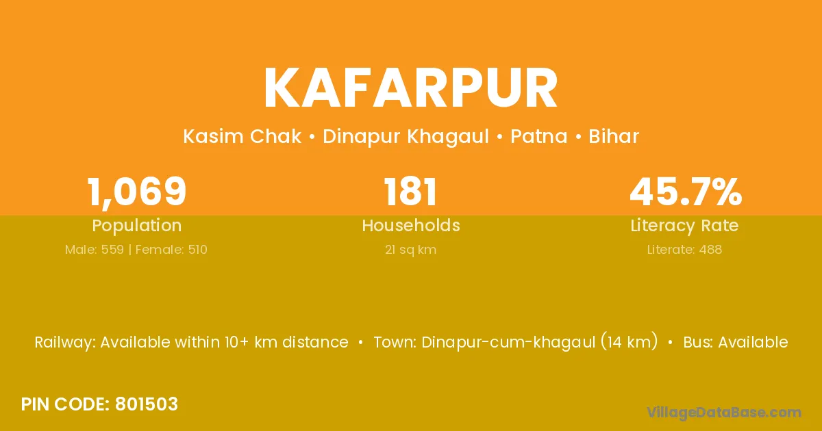 Dinapur-cum-khagaul (14 km) is the nearest town to Kafarpur village for major economic activities and is located approximately 14 km away.