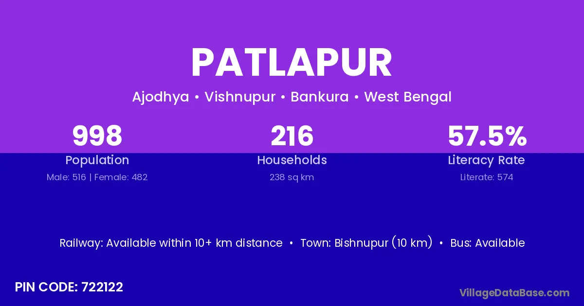 The literacy rate of Patlapur village is 44.98%. Male literacy stands at 55.79% and female literacy at 33.14%.