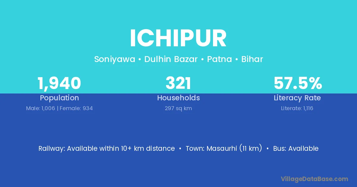 Masaurhi (11 km) is the nearest town to Ichipur village for major economic activities and is located approximately 11 km away.