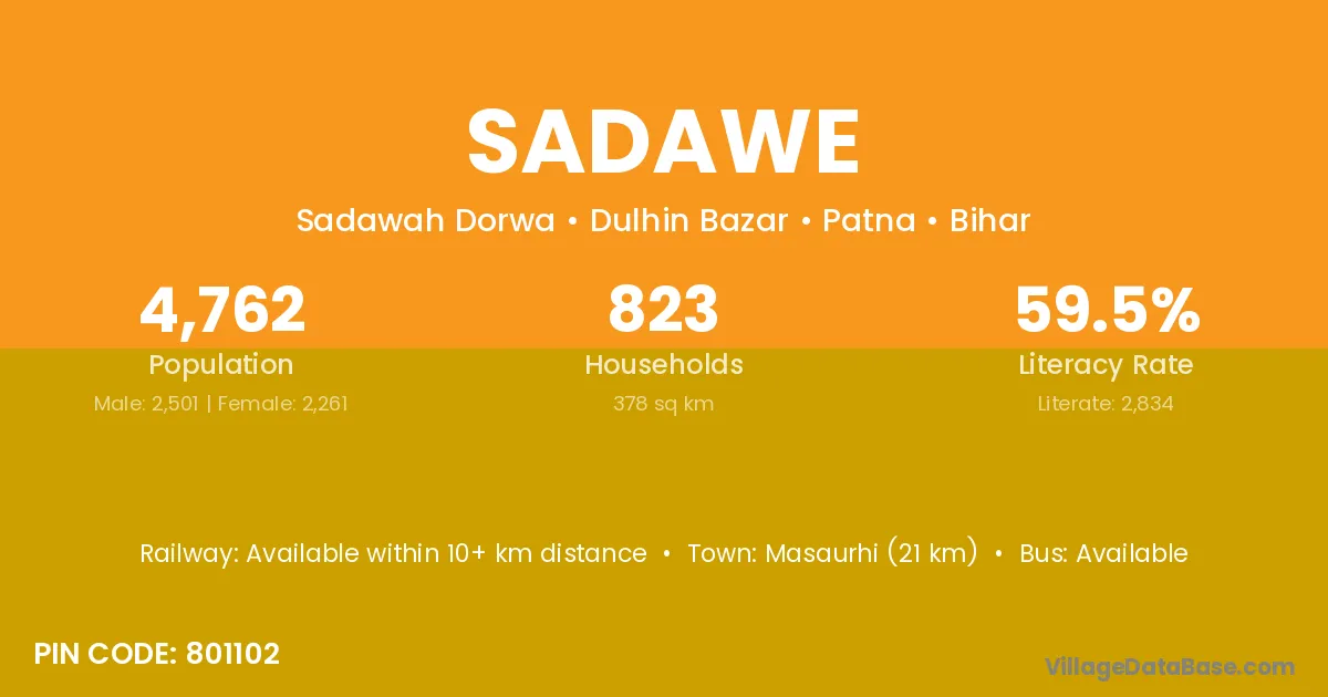 Masaurhi (21 km) is the nearest town to Sadawe village for major economic activities and is located approximately 21 km away.
