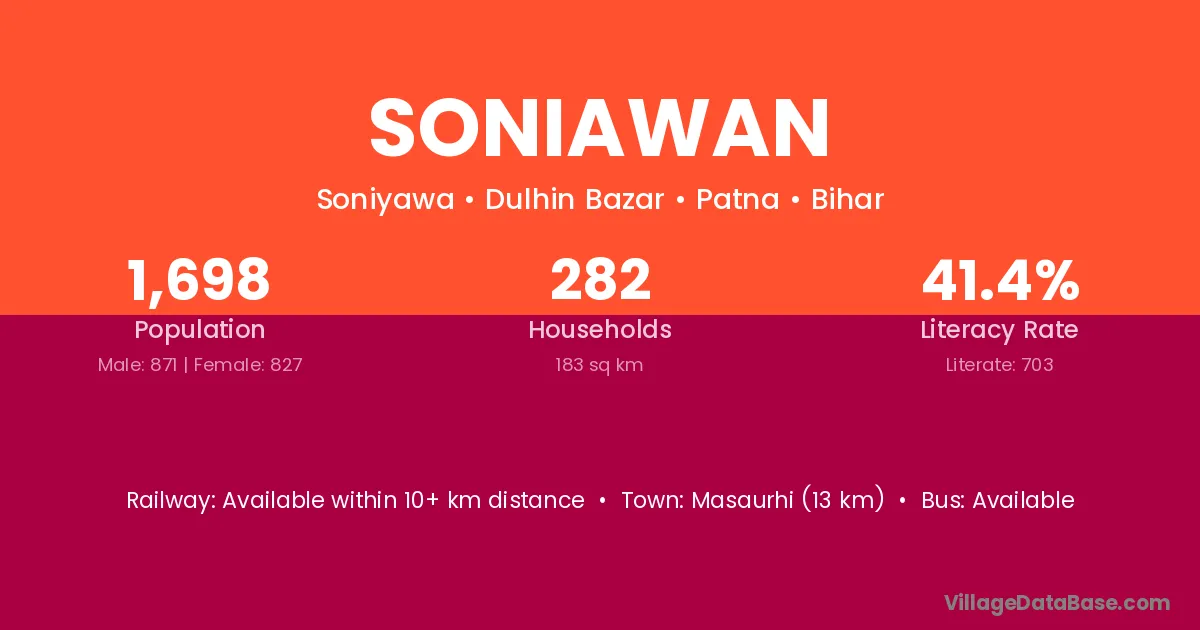 Masaurhi (13 km) is the nearest town to Soniawan village for major economic activities and is located approximately 13 km away.