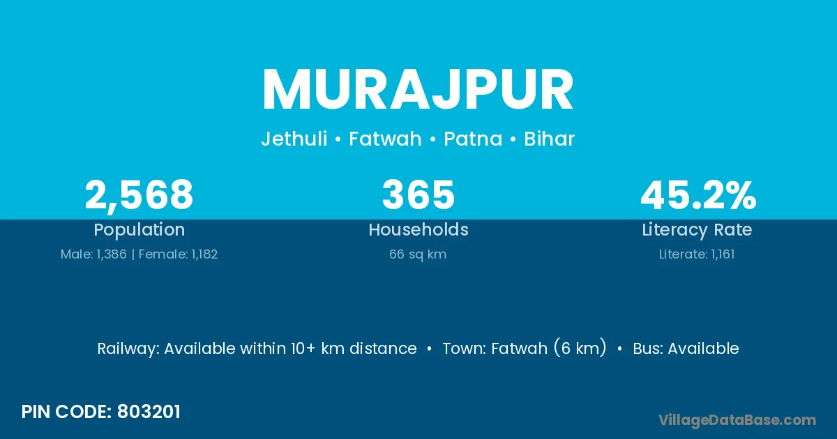 Fatwah (6 km) is the nearest town to Murajpur village for major economic activities and is located approximately 6 km away.