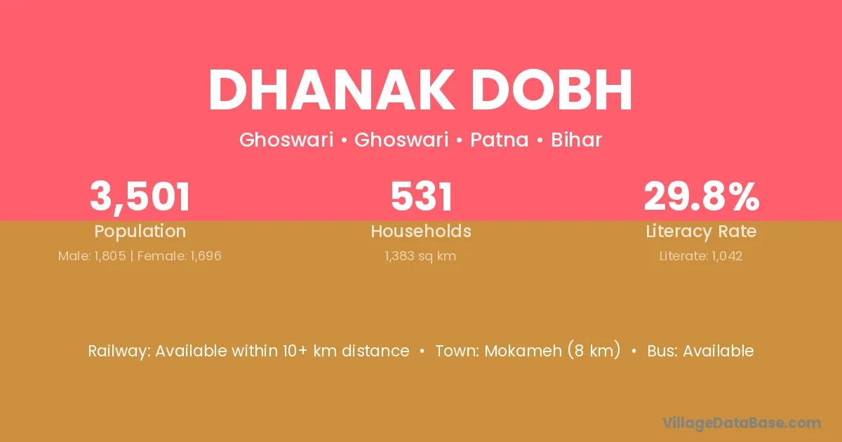 Mokameh (8 km) is the nearest town to Dhanak Dobh village for major economic activities and is located approximately 8 km away.