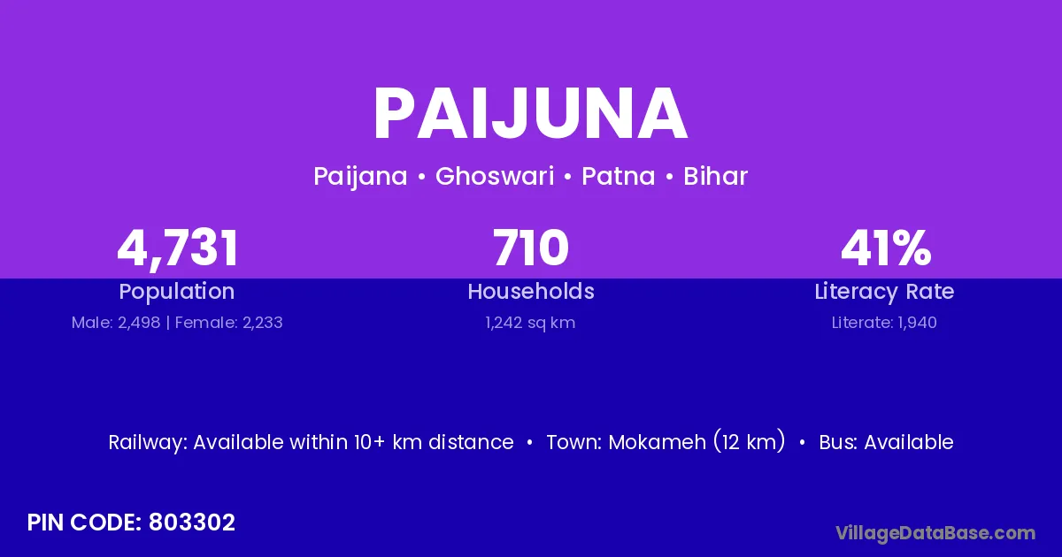 Mokameh (12 km) is the nearest town to Paijuna village for major economic activities and is located approximately 12 km away.