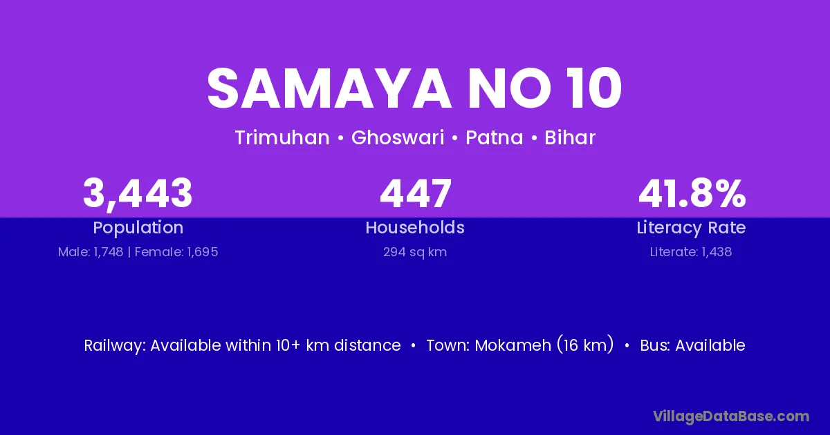 Mokameh (16 km) is the nearest town to Samaya No 10 village for major economic activities and is located approximately 16 km away.