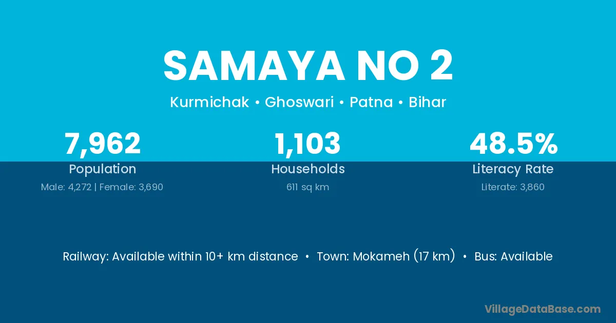 Mokameh (17 km) is the nearest town to Samaya No 2 village for major economic activities and is located approximately 17 km away.