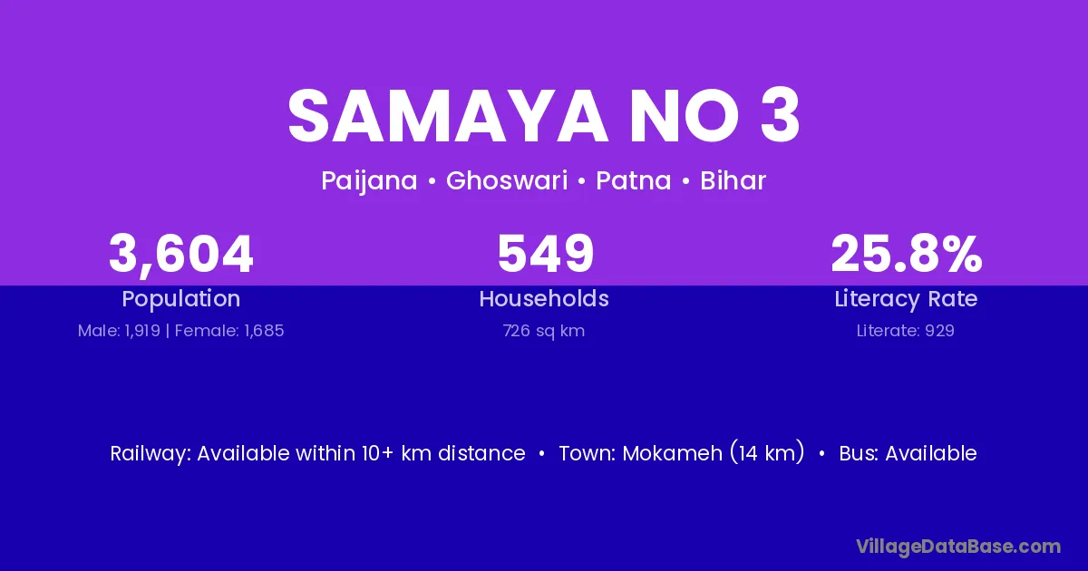 Mokameh (14 km) is the nearest town to Samaya No 3 village for major economic activities and is located approximately 14 km away.