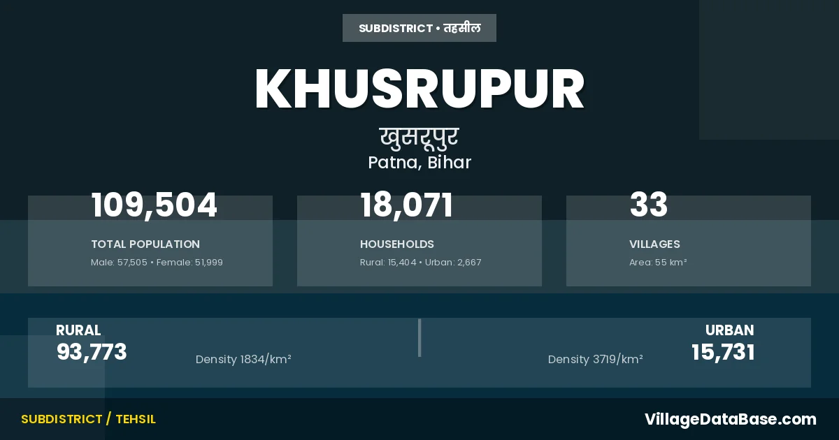 According to the 2011 census The total area of Khusrupur Subdivision is 55 km², with a population of 109504 people. The population density is 1,978 inhabitants per square kilometre, and there are approximately 18071 houses in the sub district.