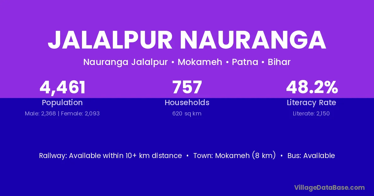 Mokameh (8 km) is the nearest town to Jalalpur Nauranga village for major economic activities and is located approximately 8 km away.
