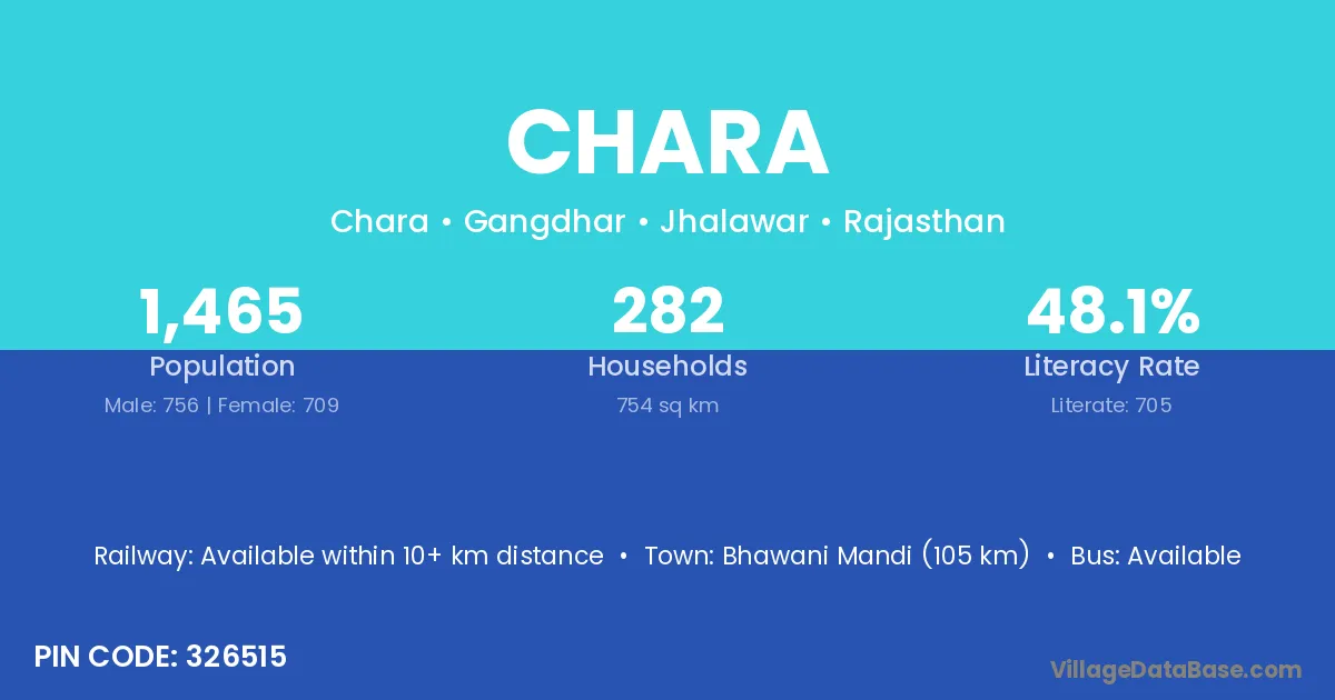 The literacy rate of Chara village is 62.77%. Male literacy stands at 70.61% and female literacy at 54.62%.