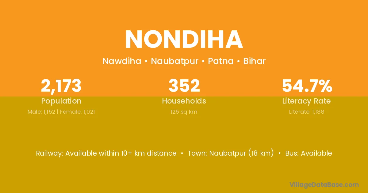 Naubatpur (18 km) is the nearest town to Nondiha village for major economic activities and is located approximately 18 km away.