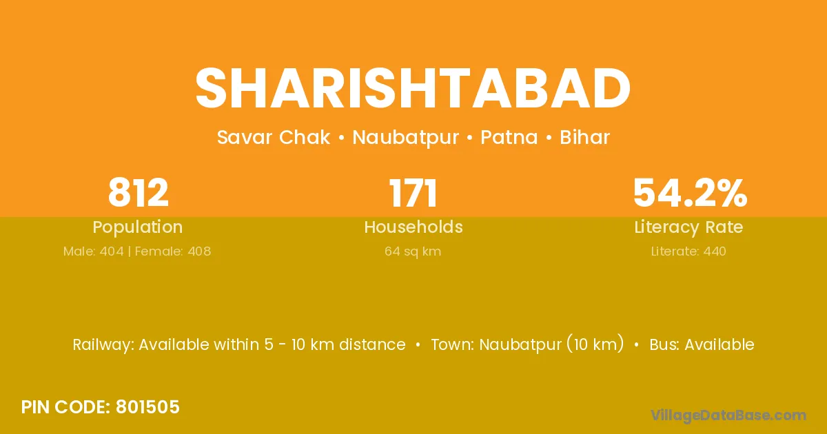 Sharishtabad village has a total population of 812 people, of which 404 are males and 408 are females.