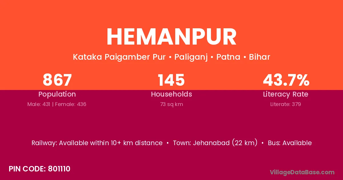 Jehanabad (22 km) is the nearest town to Hemanpur village for major economic activities and is located approximately 22 km away.