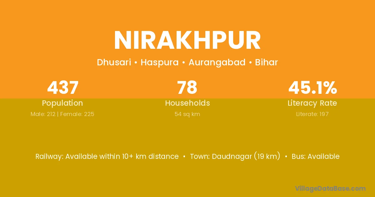 Jehanabad (22 km) is the nearest town to Nirakhpur village for major economic activities and is located approximately 22 km away.