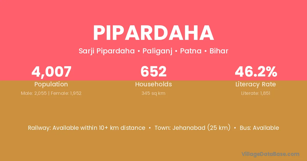 Jehanabad (25 km) is the nearest town to Pipardaha village for major economic activities and is located approximately 25 km away.