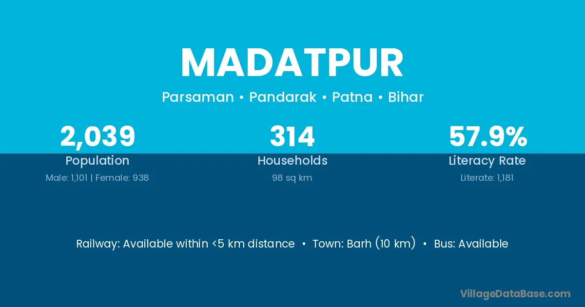 Barh (10 km) is the nearest town to Madatpur village for major economic activities and is located approximately 10 km away.