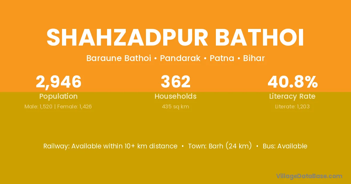 Barh (24 km) is the nearest town to Shahzadpur Bathoi village for major economic activities and is located approximately 24 km away.