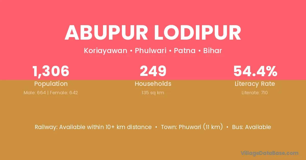 Abupur Lodipur village has a total population of 1,306 people, of which 664 are males and 642 are females.