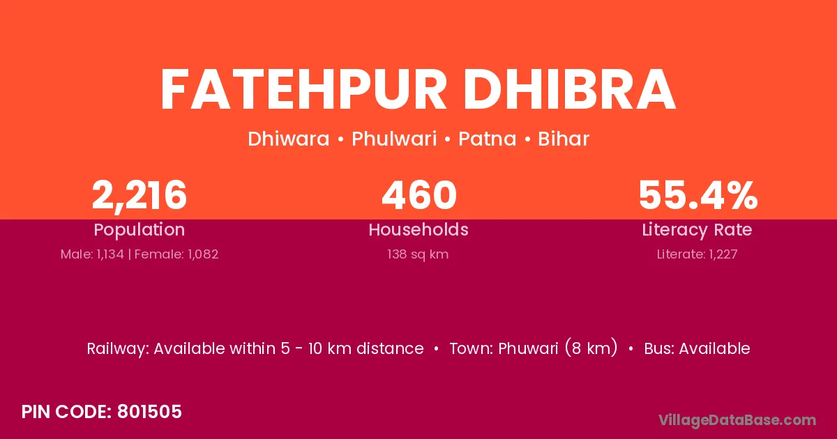 Fatehpur Dhibra village has a total population of 2,216 people, of which 1,134 are males and 1,082 are females.