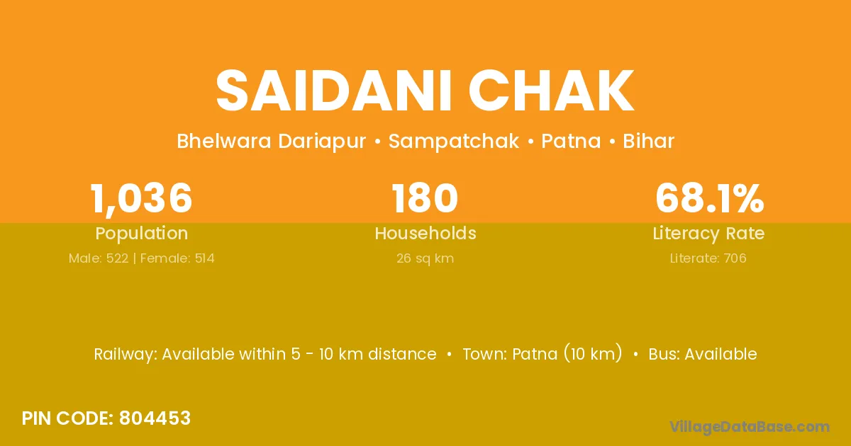 Patna (10 km) is the nearest town to Saidani Chak village for major economic activities and is located approximately 10 km away.